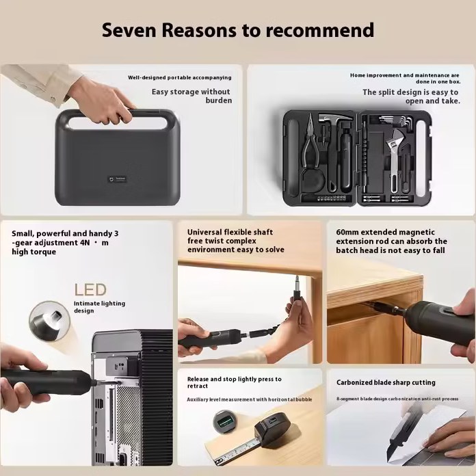 جعبه ابزار چندمنظوره شیائومی Mijia Toolbox (MJGJX001QW)، یک کیت ابزار حرفهای و هوشمند طراحی شده برای استفادههای خانگی و پروژههای DIY است. این جعبه ابزار ضمن داشتن ابزار دستی متنوع، مجهز به پیچگوشتی برقی Straight با سه سطح گشتاور تا 4 نیوتنمتر است و دارای باتری داخلی ۲۰۰۰ میلیآمپرساعتی قابل شارژ از طریق درگاه USB‑C میباشد. نور LED داخلی امکان استفاده در فضاهای کمنور را فراهم میکند. ابزارهای موجود شامل آچار قابل تنظیم، چکش پنجهای، سیمچین، متر خودقفل، مجموعه کلید بکس، کاتر و مجموعه سریهای متنوع برای پیچگوشتی است که تمام نیازهای معمول تعمیراتی را پوشش میدهد